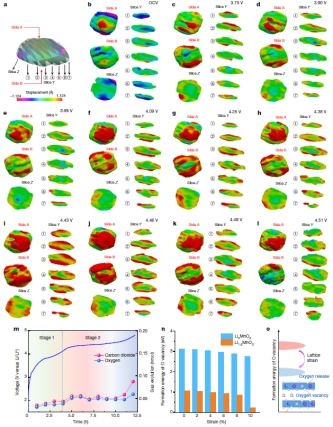 为了揭示这一问题的答案,深圳研究生院的潘锋教授团队与美国阿贡国家实验室的Amine教授/陆俊研究员团队通力合作,通过纳米尺度的原位X射线相干衍射成像技术,揭示了微观晶格应变是导致富锂氧化物正极材料发生结构退化和氧流失的原始驱动力。结合多尺度的表征技术,进一步揭示了材料中二种LiTMO2相和Li2MnO3相异质纳米畴区结构在电化学脱锂时呈现不均匀性膨胀导致应力不断积聚引发的晶格应变,当超过临界点时会发生原子迁移与流失从而导致相结构演化与持续的退化。该工作经过团队历时5年的持续努力成果近日以“Origin of structural degradation in Li-rich layered oxide cathode”为题发表于《自然》杂志(Nature 2022,DOI:10.1038/s41586-022-04689-y)。