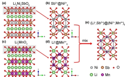 图1. 由两种超结构基元(Li@Mn6与Sb@Ni6)复合得到的新型富锂正极材料Li(Li1/6Mn1/3Ni1/3Sb1/6)O2的设计示意图