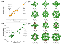 博一吧白菜网站大全潘锋课题组与美国密歇根州立大学数学系魏国卫教授课题组合作首次将以持续同调为基础的数学方法引入材料科学中,利用持久同源将高维空间中的材料结构映射到低维拓扑空间,从而更方便地研究结构与性能之间的关系。团队将持续同调方法引入碳硼烷体系的分析,通过对这些结构的拓扑指纹的分析,建立起基于拓扑不变量及其持久长度的模型。利用拓扑不变量(β0, β1和β2)定量分析和预测了碳硼烷结构以及其对应BnHn2-的相对能量。通过利用拓扑不变量(β0, β1和β2)的平局长度特征,可以将该拓扑信息与BnHn2- (n = 5~20)的相对能量进行精确拟合,Pearson相关系数为0.977,而相应的碳硼烷结构C2Bn - 2Hn (n = 5~20)的Pearson相关系数为0.937,如图1。该工作以令人满意的精度证明了持续同调方法应用于多原子体系的的可行性,提供了一种新型的团簇结构描述符(Chinese J. Struct. Chem. 2020, 39(6), 999-1008)。在未来的工作中,我们可以利用更有效的机器学习方法,根据持续同源得到的拓扑信息,建立结构与性质之间的关系,实现更大原子数量的碳硼烷结构的预测。