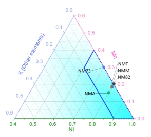 图2. 全新的无钴层状正极材料LiNiαMnβXγO2。
