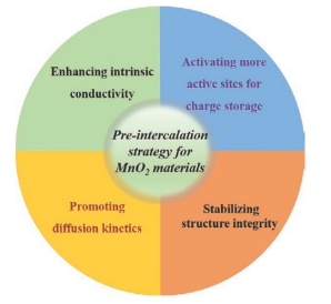 MnO2在作为各种电池正极材料时一直存在一些难以解决的问题,包括MnO2的低电导率、低的可逆充放电深度,以及离子晶体结构中扩散动力学缓慢等问题。预嵌入策略在MnO2正极材料应用有积极的作用,包括提高电子/离子电导、促进激活反应活性位点、提高扩散动力学、和提高电化学过程中材料晶体结构的稳定性, 但预嵌入策略所面临的一些挑战,研究团队针对基于该策略研发高性能MnO2材料提出了发展的展望。